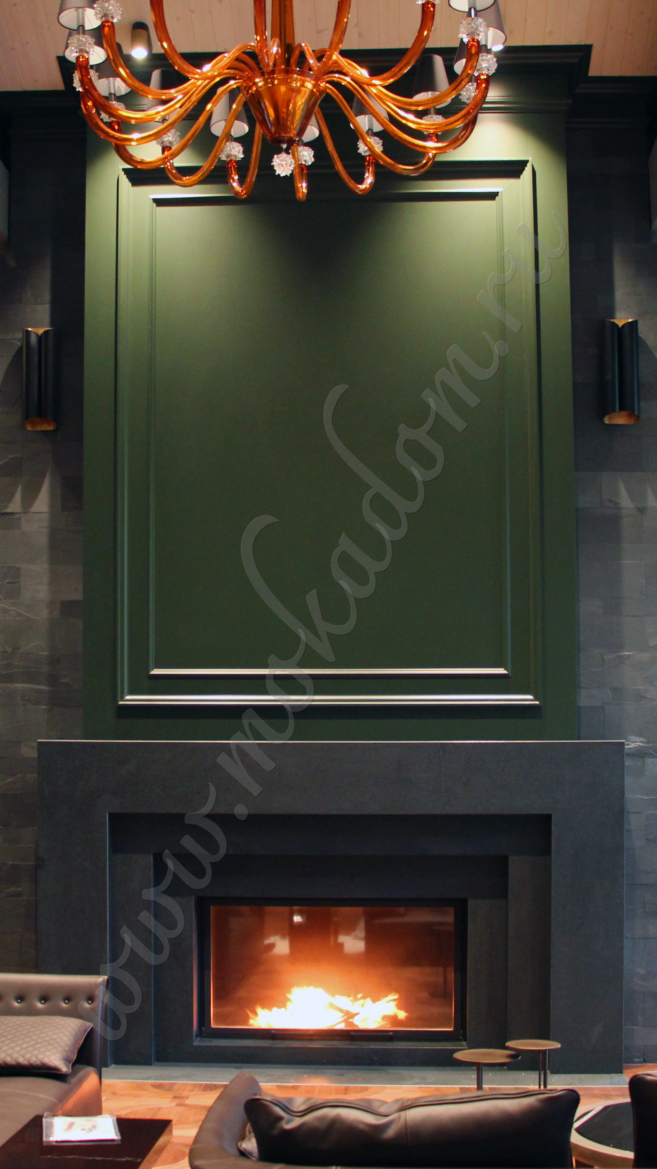 Каминная топка по индивидуальным меркам, размер которой впечатляет (ширина 1500 мм, высота 800 мм). Оснащена жаропрочным подъемным стеклом, футеровка топливной камеры - черным металлом.