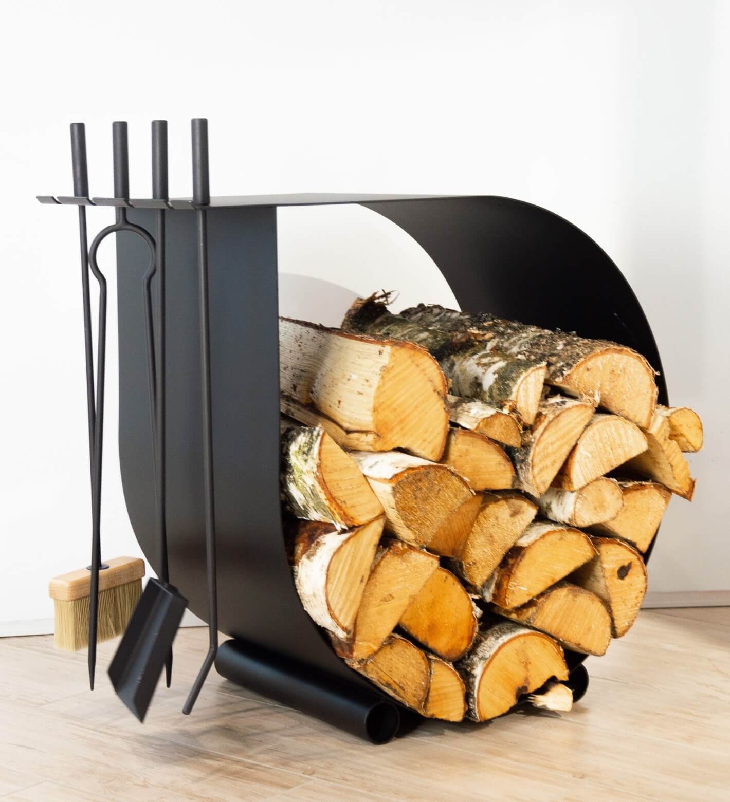В комплект входит четыре аксессуара для камина: совок, метёлка, кочерга и щипцы. Дровница оборудована держателями для всех четырёх, что позволяет хранить всё, что понадобится Вам для работы с камином, в одном месте.