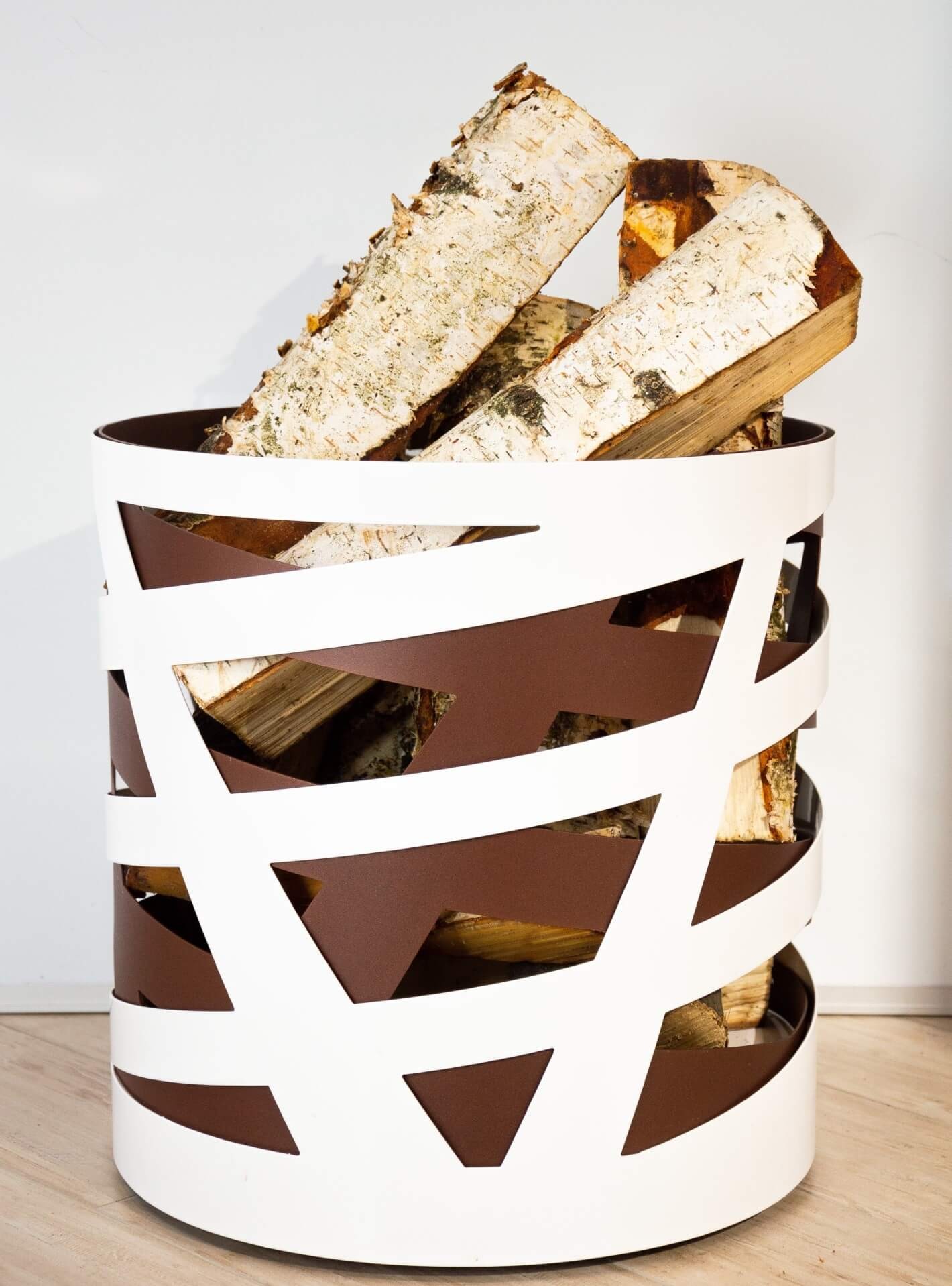 Сочетание минимализма и лёгкости — вот принцип, выбранный при дизайне бело-коричневой дровницы Saturn. Её форма и цветовая гамма удачно дополняют друг друга.